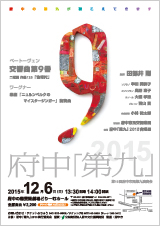 16.府中「第九」2015 第16回府中市民第九演奏会 2015年12月6日(日)14:00開演 府中の森芸術劇場 どりーむホール 指揮:田部井 剛 ソプラノ:半田 美和子 メゾソプラノ:奥野 恵子 テノール:大槻 孝志 バリトン:青山 貴 合 唱 :府中「第九」2015合唱団 曲目 ベートーヴェン:交響曲第9番 ニ短調 作品125「合唱付」 歌劇「ニュルンベルクのマイスタージンガー」前奏曲 主催:府中「第九」2015実行委員会 協賛:公益財団法人 府中文化振興財団 後援:府中市
