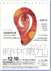 17.府中「第九」2017 第17回府中市民第九演奏会 2017年12月10日(日)14:00開演 府中の森芸術劇場 どりーむホール 指揮:田部井 剛 ソプラノ:半田 美和子 メゾソプラノ:奥野 恵子 テノール:望月 哲也 バリトン:青山 貴 合 唱 :府中「第九」2017合唱団 曲目 ベートーヴェン:交響曲第9番 ニ短調 作品125「合唱付」 歌劇「コリオラン」前奏曲 主催:府中「第九」2017実行委員会 協賛:公益財団法人 府中文化振興財団 後援:府中市