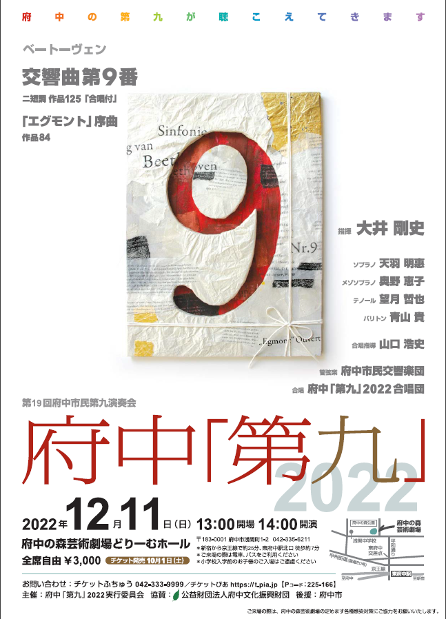 19.府中「第九」2022 第19回府中市民第九演奏会 2022年12月11日(日) 14:00開演 府中の森芸術劇場 どりーむホール 指揮:大井 剛史 ソプラノ:天羽 明惠 メゾソプラノ:奥野 恵子 テノール:望月 哲也 バリトン:青山 貴 管弦楽:府中市民交響楽団 合唱:府中「第九」2022合唱団 合唱指導:山口 浩史 曲目: ベートーヴェン:交響曲第9番 ニ短調 作品125「合唱付」 ベートーヴェン:劇音楽「エグモント」序曲 作品84 主催:府中「第九」2022実行委員会 協賛:公益財団法人 府中文化振興財団 後援:府中市